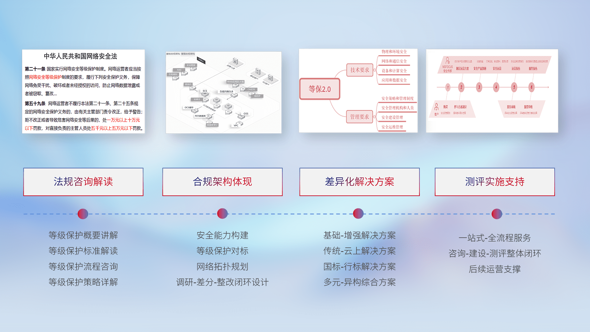 通过专业的法律咨询解读、、合规架构体现、、差异化解决方案、、测试实施支持等服务,,为客户量身打造等保合规体系。。。。